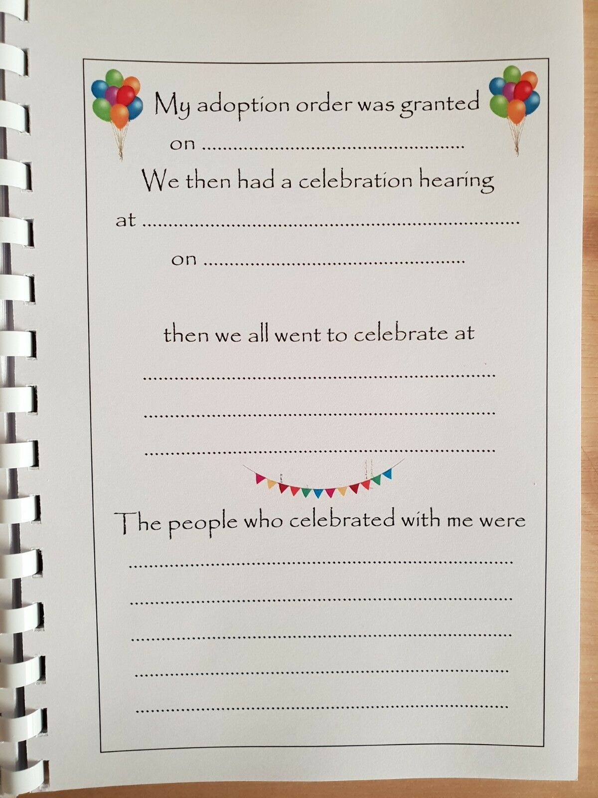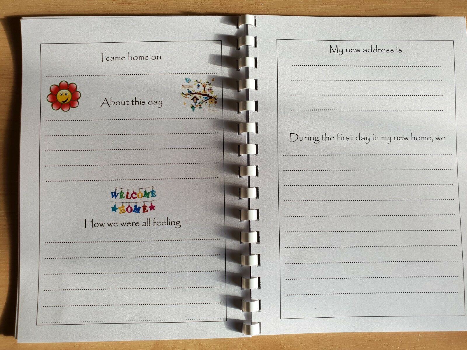 The book, which is A5 contains 23 double sided pages (46 in all) and includes sections relating to the adoption from the first introductions right through to the child's first year in their forever home. Each page is a record of dates, times, feelings and thoughts, adoption process etc and there are also spaces for corresponding photgraphs. All bound together with a white plastic comb binder.